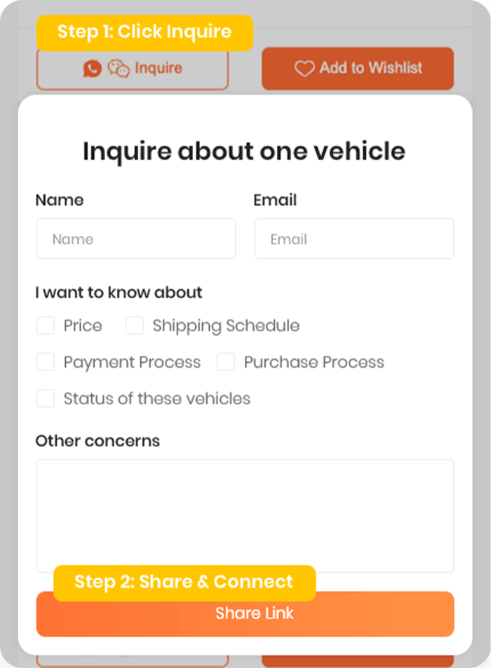 Use our tool to find your ideal cars from across China. When you find a car you like, add it to your centralized Inquiry List. Got a list ready? Simply share the unique link to your Inquiry List with your Chinese export partner to get the process started. Don't have a partner yet?No problem. We're happy to introduce you to verified exporters.